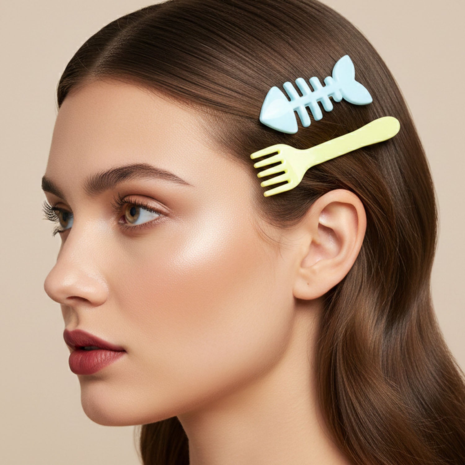 Cute Food Shape Hair Clip Set – Trendy Fork Fish Bone Drumstick & Spatula Design Alligator Hair Pins for Girls Stylish Everyday Hair Accessories (4 Pc)