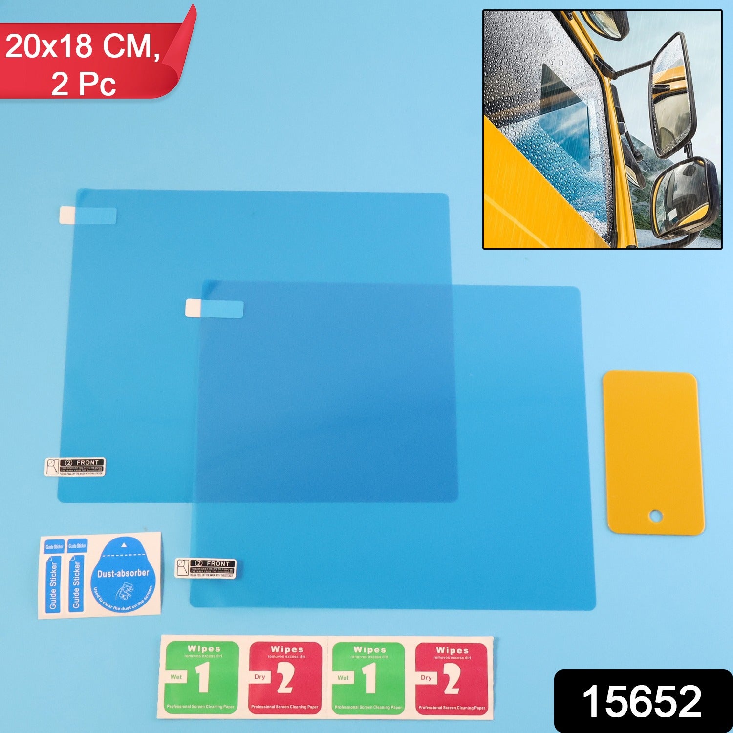This high-clarity anti-fog and anti-water stain protection film set is designed to dramatically improve visibility while driving in rain, fog or humid conditions. Each sheet provides a crystal-clear protective layer that repels water droplets, reduces glare and prevents mist build-up on side mirrors, making your driving experience safer and more comfortable. The 20×18 CM size is ideal for most car mirrors and can be trimmed if required for a perfect fit. The included wet and dry wipes, dust absorber and applicator card ensure a smooth, bubble-free installation in minutes. Durable, weather-resistant and long-lasting, this film set acts as a reliable shield against dust, scratches and everyday wear for your vehicle’s mirrors.