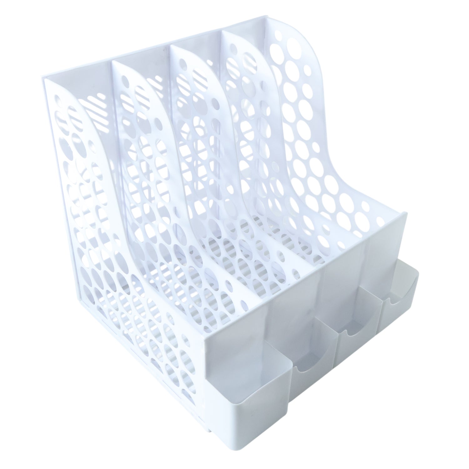 This multipurpose desk organizer file holder is designed to keep office and study spaces neat, organized, and clutter-free. Featuring multiple vertical slots, it allows easy arrangement of files, books, notebooks, and folders in an upright position for quick access. The front compartments are ideal for storing pens, markers, scissors, and other daily stationery essentials. Its open-grid design ensures visibility and airflow, making it suitable for regular use without overcrowding the workspace. Perfect for offices, study tables, and home desks, this organizer enhances productivity while maintaining a clean and organized environment.