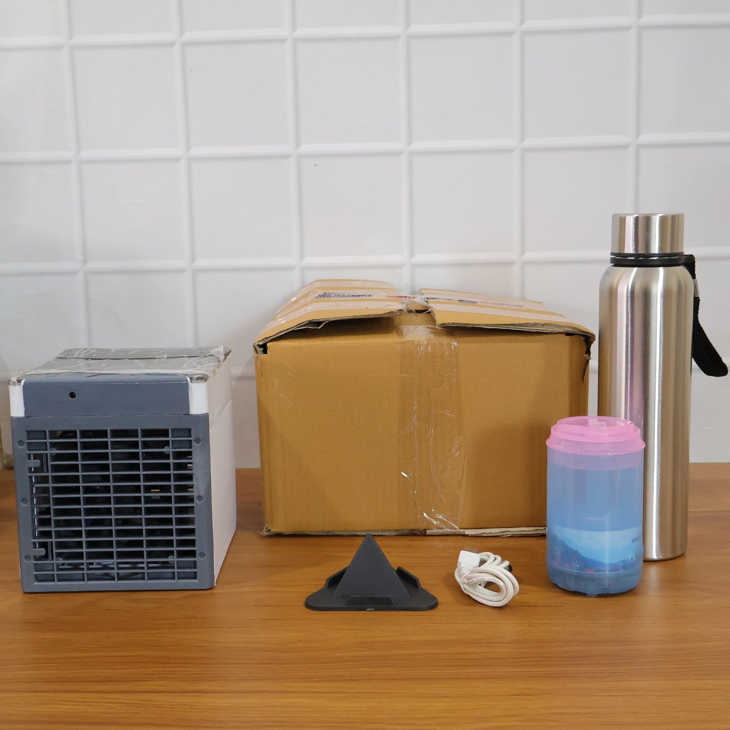 office essentials combo set, mini desktop air cooler fan, stainless steel water bottle, portable sipper bottle, home office accessories, study desk essentials, workstation utility kit, desktop cooling fan, eco-friendly water bottle, travel sipper bottle, compact office gadget set, office hydration kit, personal desk organizer set, lightweight desktop fan
