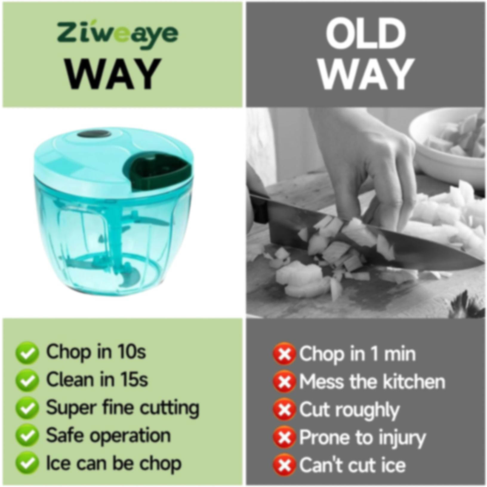 - Safe to use: no need electrical, no need to contact blades when cutting foods.
